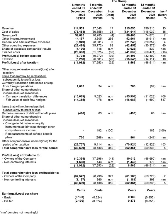 The Group reported a net loss attributable to owners of the Company of S$10.4 million in 2H 2025, compared with a net loss of S$17.7 million in 2H 2024.